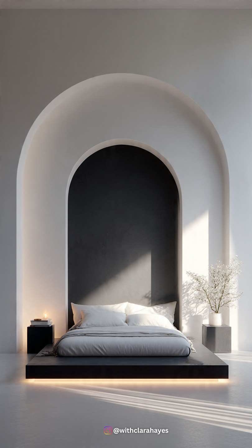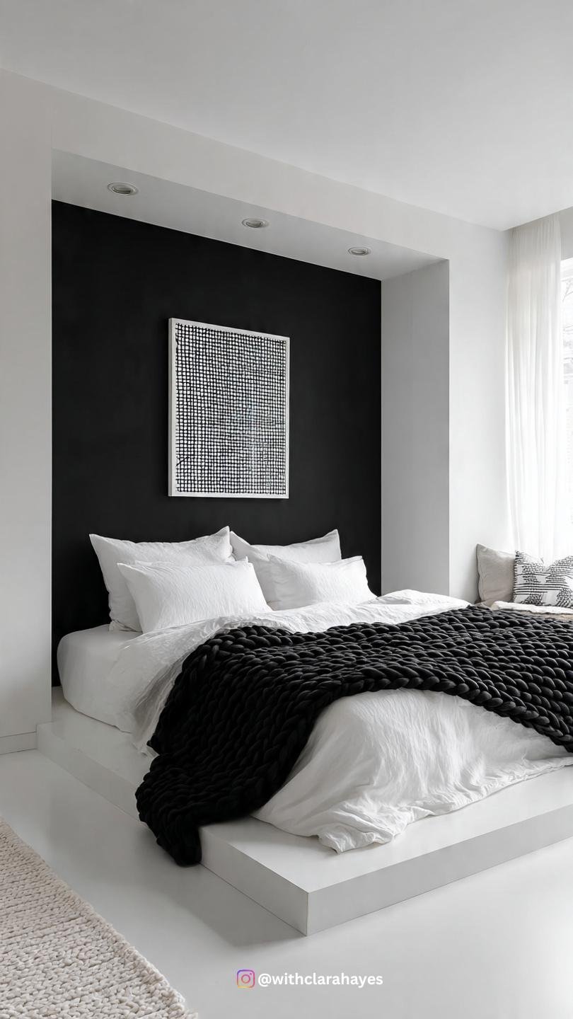 - The Wall Treatment: Create a large, thick band or painted arch in black behind the bed, leaving the rest of the walls white. This acts as a graphic, oversized “headboard.”