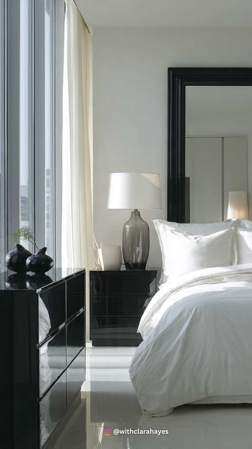 - Styling Insight: Use a large, black-framed mirror (or a full-length leaning mirror) to enhance the feeling of space and light. The reflections created by the glossy surfaces prevent the black from feeling heavy.
