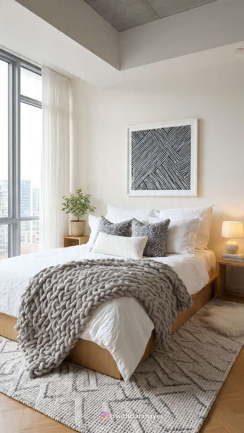 - Textural Details: Bedding should be mostly white, but incorporate a large, chunky knit black throw draped across the foot of the bed. Use a large, black and white abstract geometric print as the primary art piece.