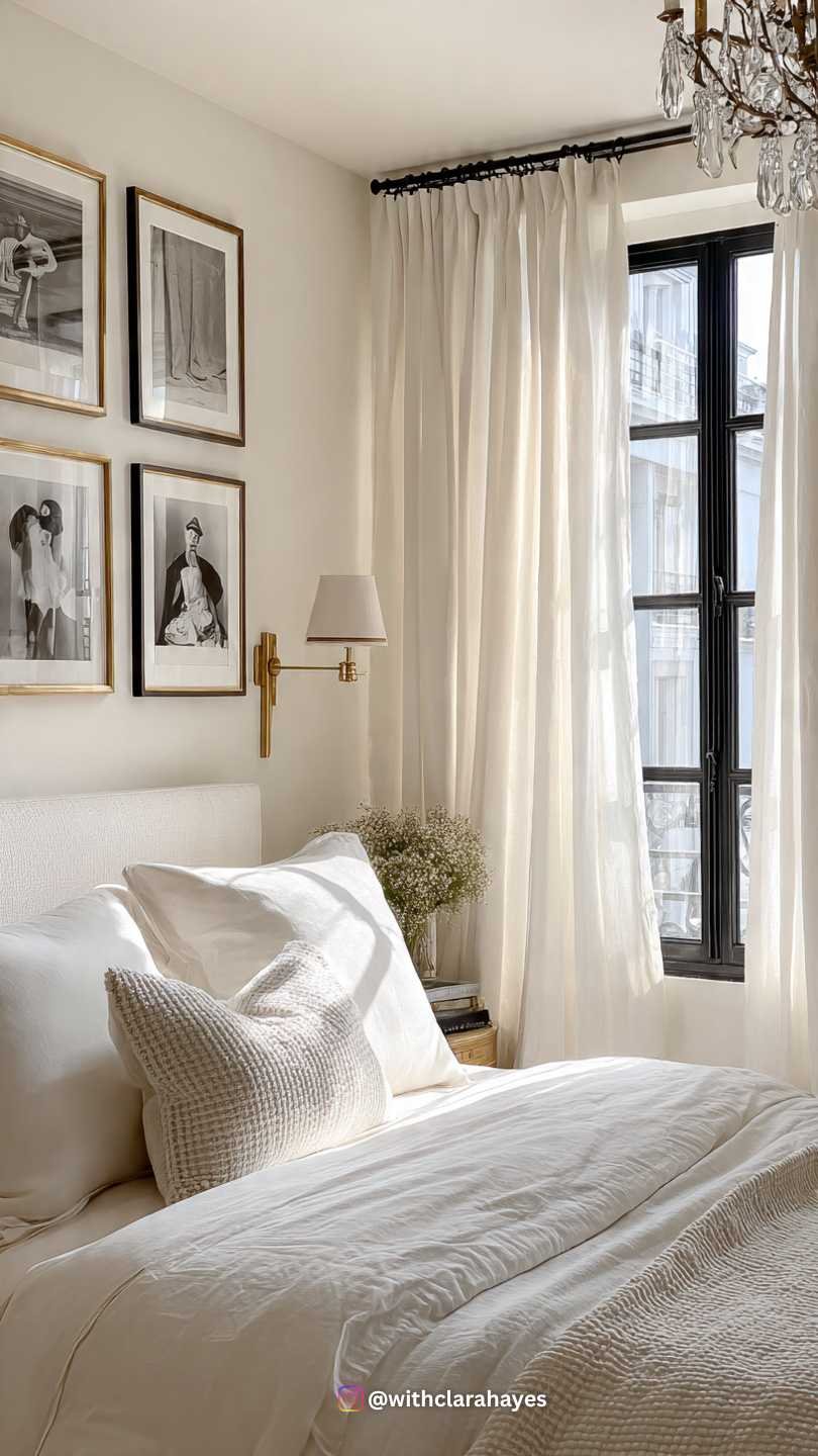 - Styling Insight: Use floor-to-ceiling curtains in sheer white or cream to soften the strong lines of the black frame. A simple, ornate chandelier (even a small one) in black or crystal adds an element of romance.