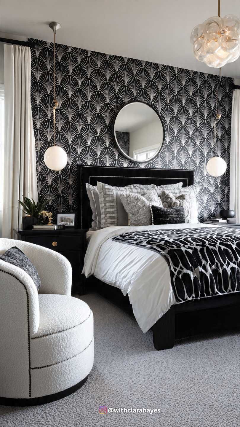 - The Pattern: Use a striking, high-contrast wallpaper on the primary wall (think fan, scallop, or a high-contrast chevron pattern).