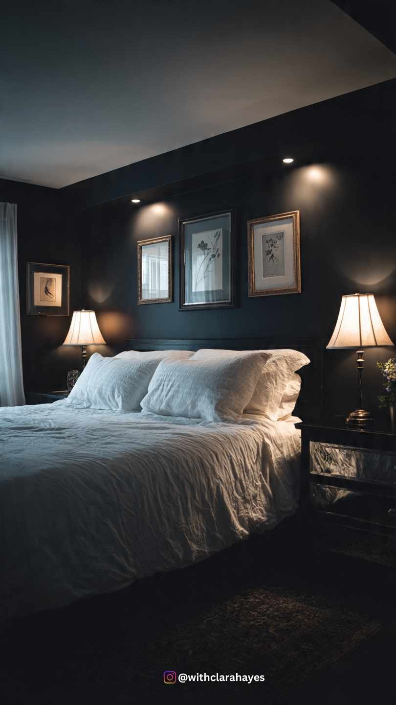 - Styling Insight: The dark walls look incredible with mirrored furniture (like mirrored nightstands) as they reflect the light and break up the darkness. Use large, bright white matting on framed art to make the pieces pop dramatically off the dark wall.