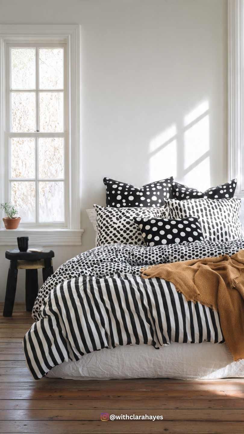 - The Mix: The bedding is where the patterns mix. Use a duvet cover with a bold black and white stripe and layer it with decorative pillows featuring a smaller pattern, like polka dots or a delicate trellis print.